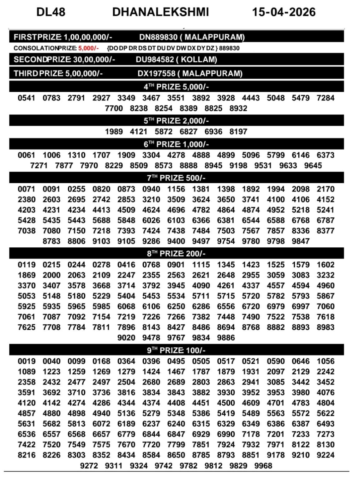 This page covers Kerala Lottery Result for 15 April 2026: DhanaLekshmi (DL). Refresh for live lottery result updates and the Kerala lottery chart once published.