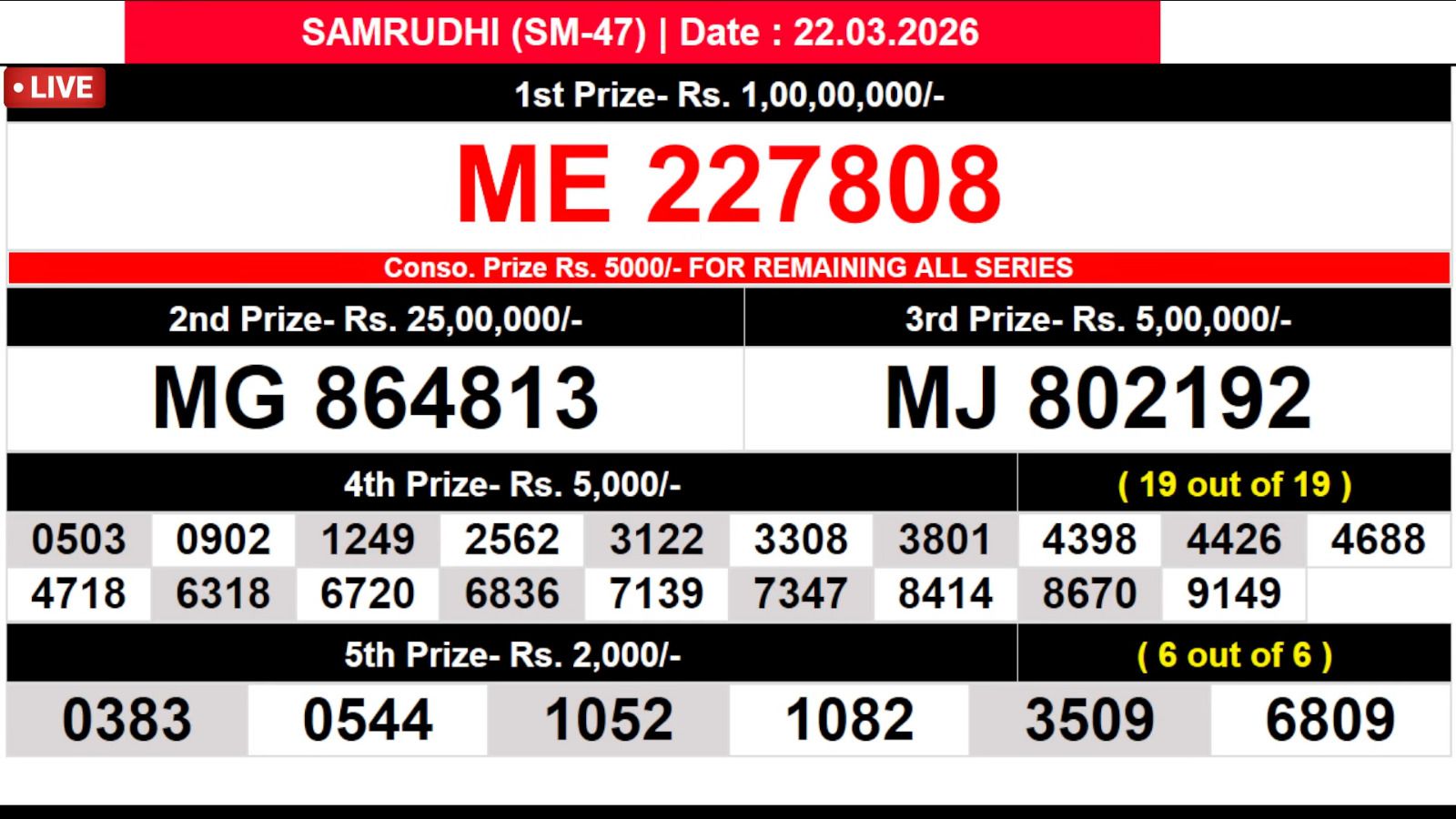 This page covers Kerala Lottery Result for 22 March 2026: Samrudhi (SM). Refresh for live lottery result updates and the Kerala lottery chart once published.