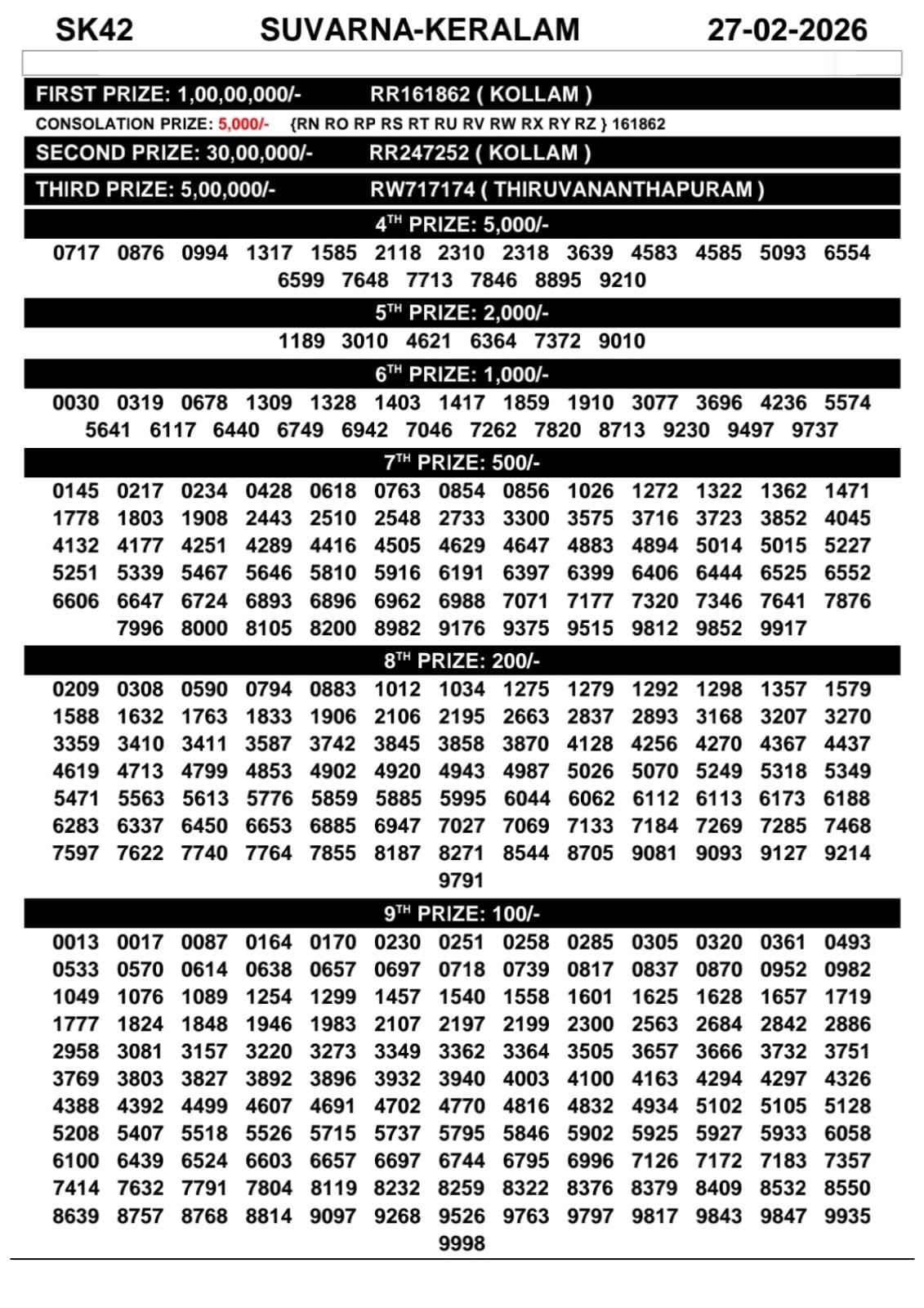 Lottery Today Result Kerala Suvarna Keralam 27.02.2026