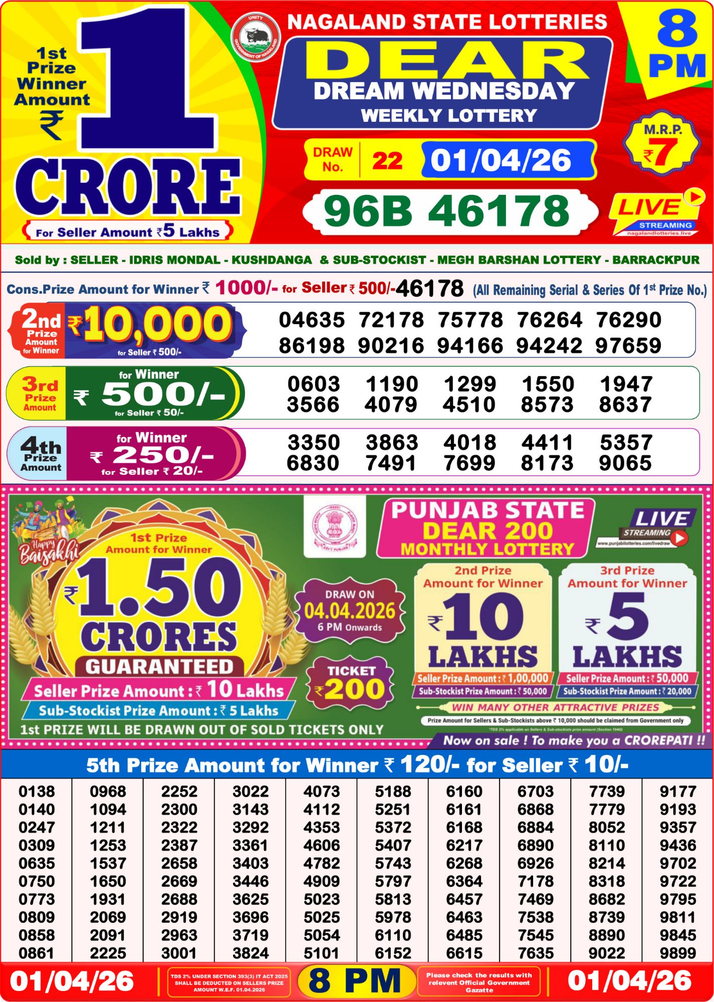 Nagaland state lottery result: 1:00 PM • Dear lottery result • Updated: 01 Apr 2026, 08:12 PM IST