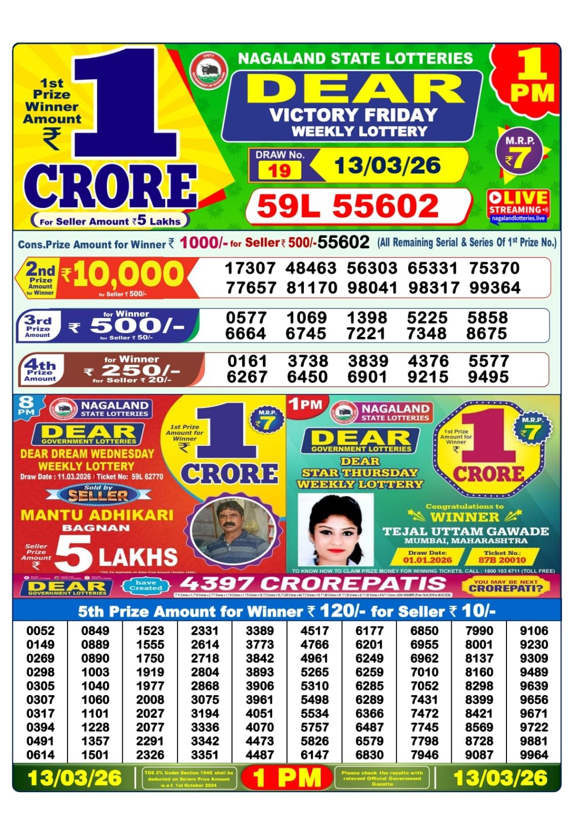 This is the today Dear Lottery result for Nagaland (1 PM). Check the live lottery result winner number and official chart below.