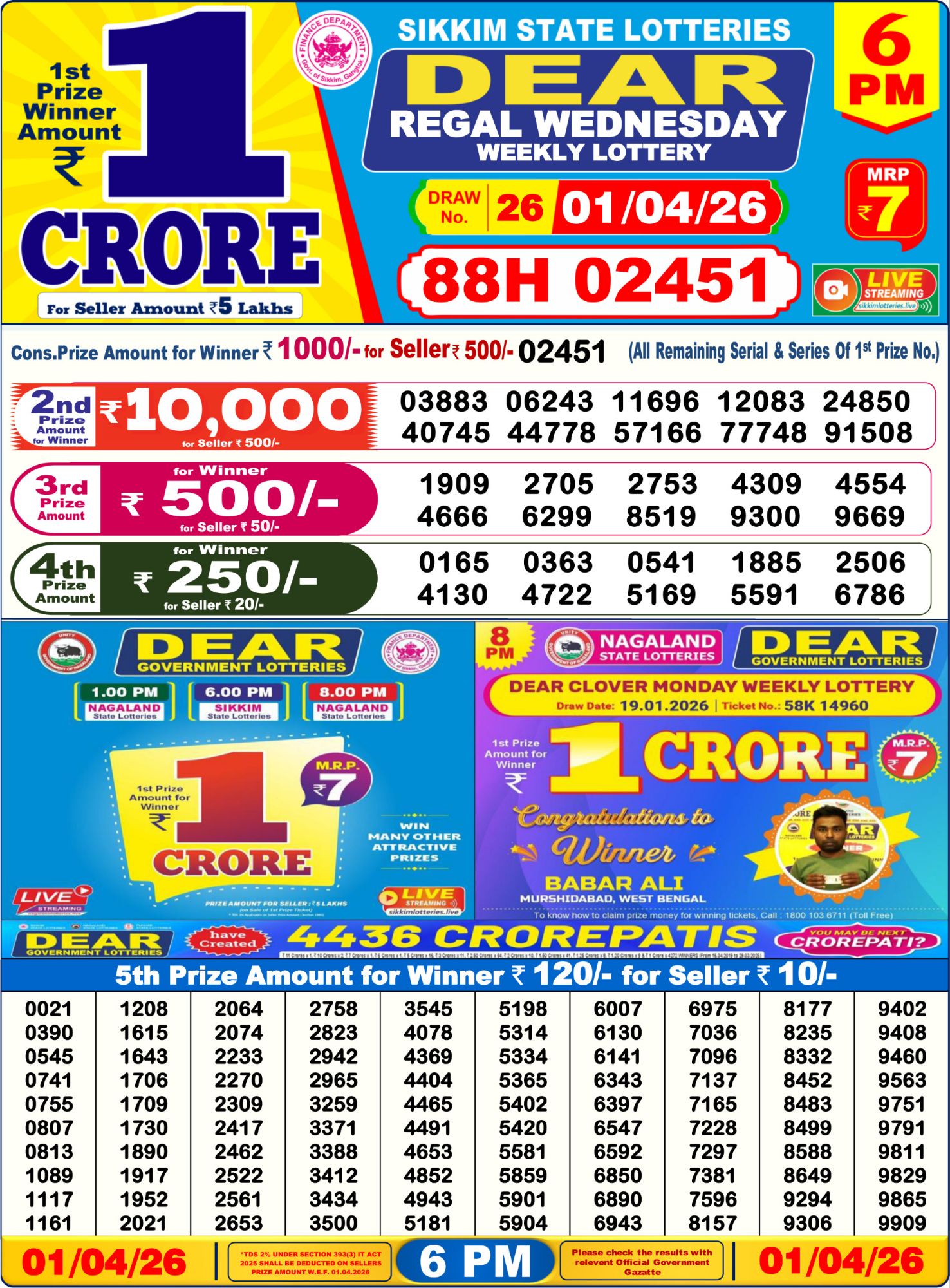 Sikkim state lottery result: 6 PM • live lottery result • Updated: 01 Apr 2026, 06:16 PM IST