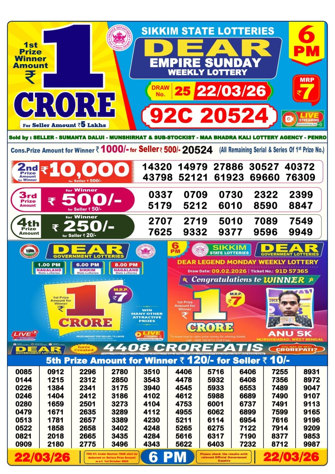 Sikkim State Lottery Result Today - Dear Empire - 22/03/2026